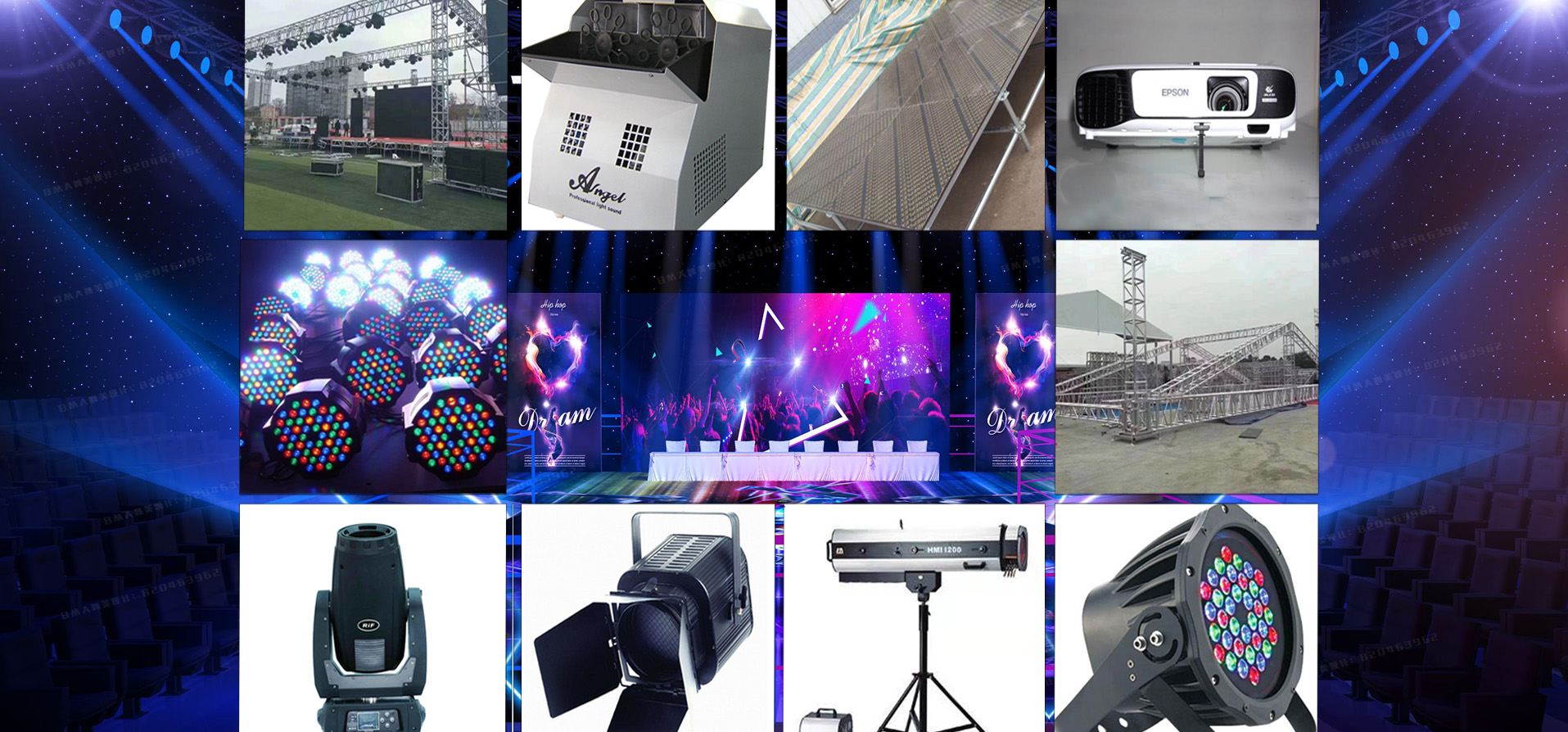 提供全程策劃執(zhí)行及燈光、音響、舞臺(tái)、背景、座椅、攝影攝像器材、氣球、拱門等設(shè)備租賃